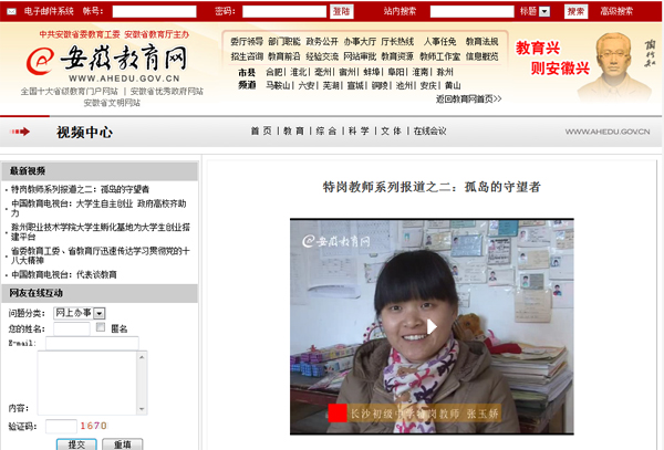 12月24日,安徽教育网以《特岗教师系列报道之二:孤岛的守望者》为题,在教育要闻栏目套红报道了beat3652010届毕业生张玉娇扎根农村教育的事迹,时长近7分钟。