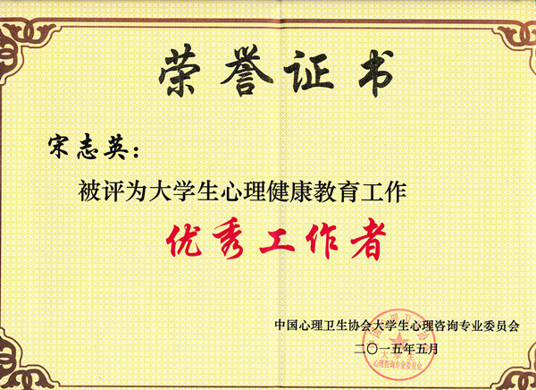 自2002年以来,宋志英老师一直从事大学生心理健康教育教学及科研工作,在高校没有全面普及大学生心理健康教育公共选修课前,曾独立申请开设“大学生成功心理训练”选修课,并组织和引领大学生成立“大学生心理协会”及“安心”心理咨询热线,指导开展相关工作,一直持续至今。10多年来,每周定期开展大学生个别心理咨询,每年正式接待大学生来访者近300人,同时不定期地针对特殊群体开展团体心理辅导,每年10余场。此项荣誉的获得,是对她多年来从事大学生心理健康教育工作的充分肯定。(贾涛)