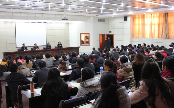 11月29日,安徽省援疆指挥部副指挥长、和田地委组织部副部长(安徽省委组织部公务员处调研员)张杰华,安徽省合作交流办副主任,安徽省援疆指挥部成员、和田维吾尔医专党委副书记、安徽省教育厅科研处调研员李方泽、皮山县组织部部长王玉满、皮山县人才办主任唐海泉、皮山县人社局局长罗方等一行11人来beat365进行考察和招聘紧缺急需人才。副院长闵永新热情接待了招聘团一行,并主持了人才招聘会。beat365招生就业处、继续教育学院和文学院负责同志,各院系分管学生工作的负责同志,大四毕业生150余人参加了招聘会。