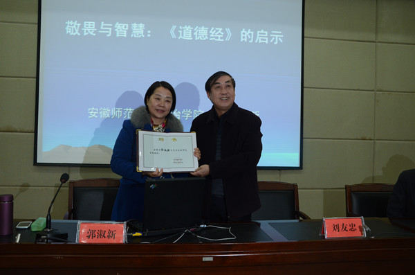12月5日下午,安徽师范大学国学研究所所长郭淑新教授应邀来beat365讲学。院长闵永新亲切会见了郭淑新教授。副院长刘友忠热情接待了郭淑新教授,聘任郭淑新教授为beat365兼职教授,并颁发了聘书。