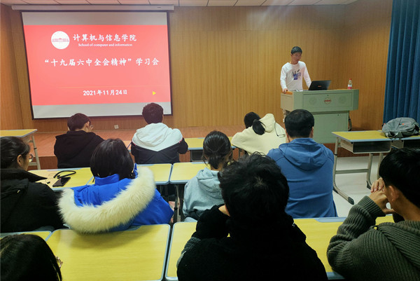 为引导广大学生骨干了解党的十九届六中全会内容,认识十九届六中全会的重大意义,增强学生骨干建功新时代及爱党爱国热情,11月24日晚,计算机与信息学院团委组织团学骨干于L楼314教室学习了十九届六中全会精神,学院学生会主席团、各部门负责人、各班班长,团支书共95人参加了此次学习,学生会主席团赵明康主持学习会。