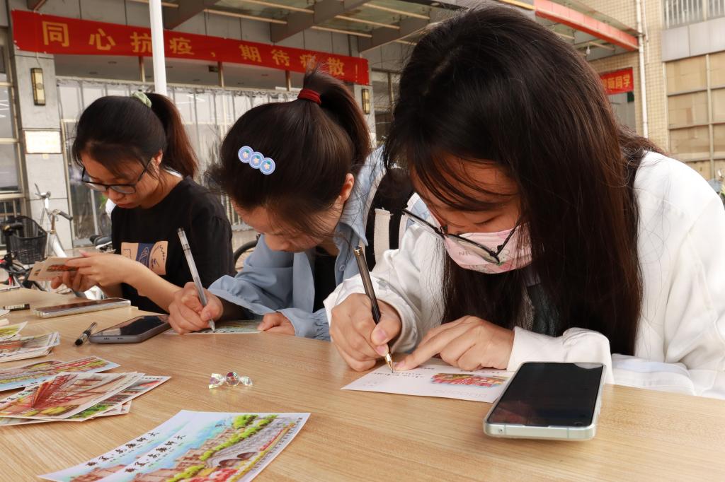 在该院学生会从事学生工作、在“三下乡”中实践成长、与同学们游山历水……活动参与者、化学专业2018级(3)班的学生汪阳,回首起过去四年的大学生活,他觉得“不虚此行”。在拍完班级毕业照后,他来到活动现场,特地从眼前这些明信片中挑出印有南门和图书馆的两张进行书写。