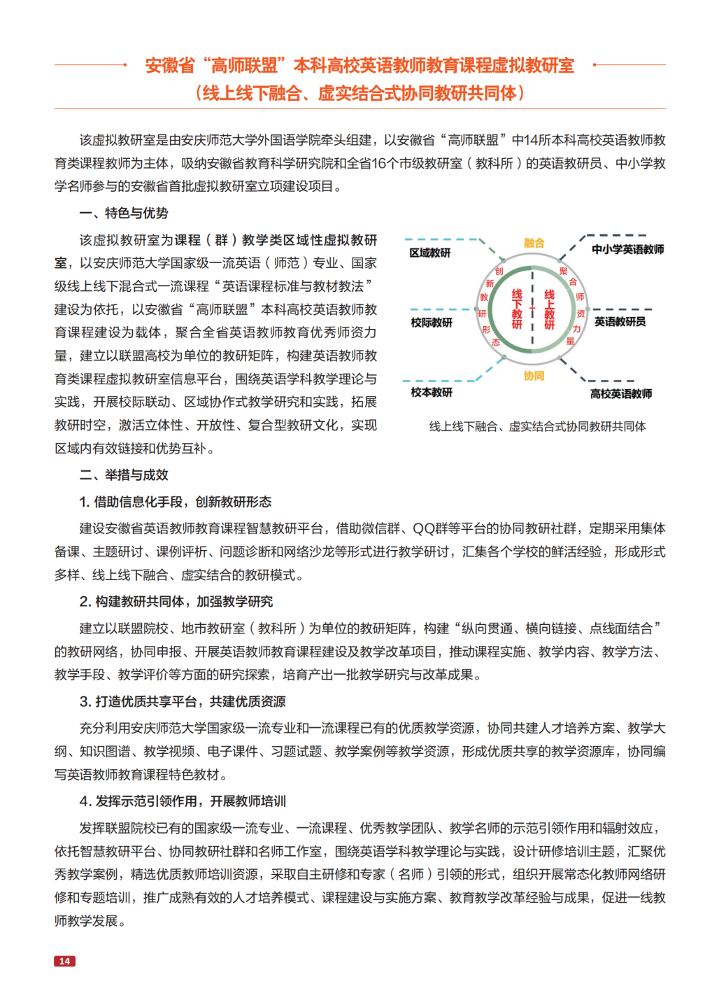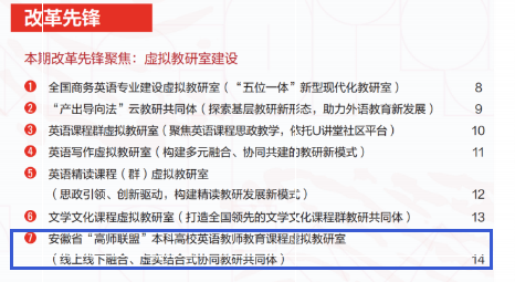 近日,外语教学与研究出版社出版《外研之声》2022年第一期“改革先锋”专栏在全国范围内遴选了7个虚拟教研室建设案例进行推介,外国语学院王先荣教授领衔组建的“安徽省‘高师联盟’本科高校英语教师教育课程虚拟教研室”为入选案例之一。