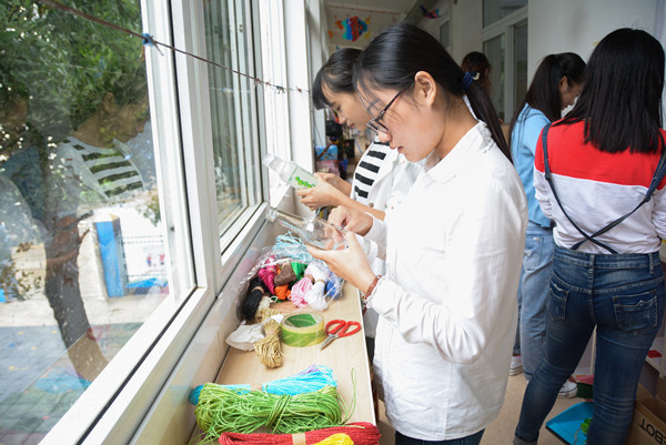 用纸板做成不同形态的猴子,将五彩的绳子一道道绕上废弃的塑料瓶,在收集的树枝上涂着各种不同的色彩……这些都是学前教育专业的同学制作的一些手工教具。近日,学前教育专业14级3班的7位同学来到安庆市墨子巷幼儿园沿江分部,为孩子们制作手工教具,带去更多的快乐。