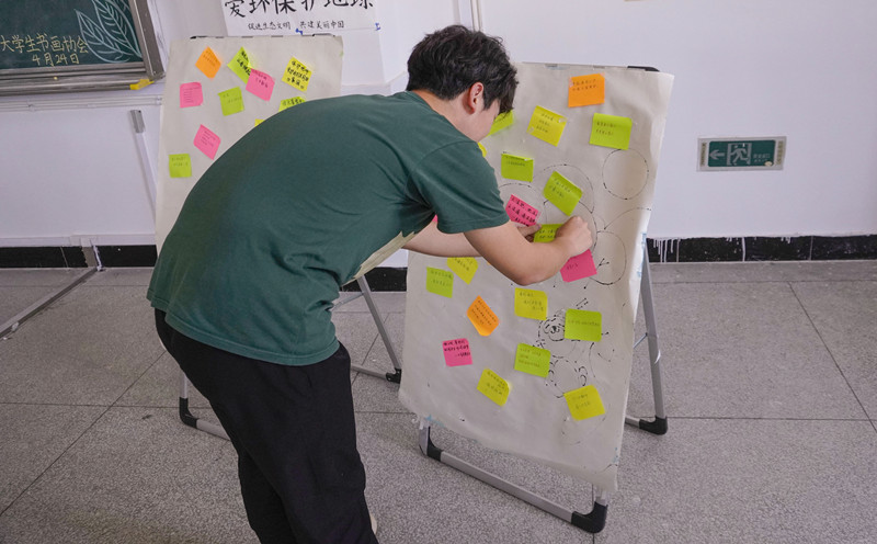 “同顶一片蓝天,共护一方水土。”活动现场除作品展览之外,学生们还参与便签留言活动,写下环保宣言。物流管理专业2021级(1)班的学生陈旭呼吁同学们从点滴小事做起,不乱丢垃圾、正确进行垃圾分类、积极参加学校社团开设的绿色环保活动……用自己微小的力量助力环保事业。