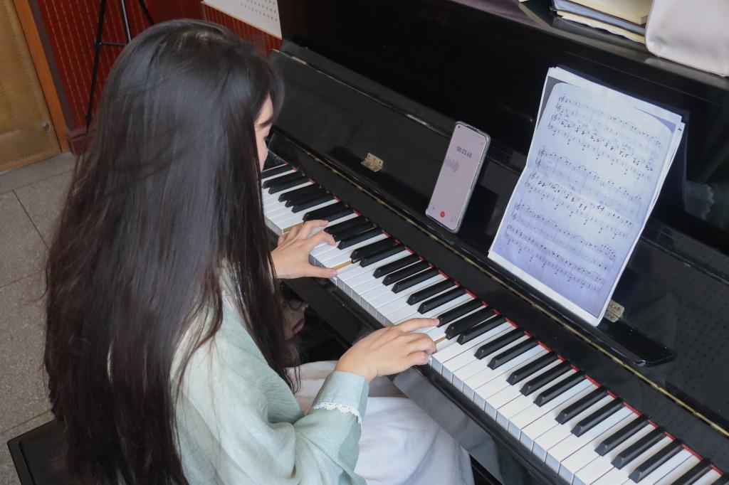 “高高的青山上,萱草花开放,采一朵,送给我,小小的姑娘。”伴着钢琴弹奏,轻柔婉转的歌声在艺术楼响起,音乐学专业2021(2)班的胡瑞萱反复练习这首《萱草花》,提前录制母亲节祝福视频。“萱草花是中国的母亲花,也叫忘忧草,我希望妈妈可以顺心顺意没有烦恼。”