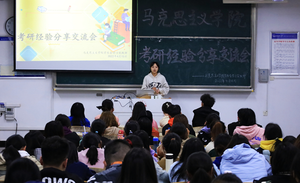 4月15日,马克思主义学院举办考研经验分享交流会,12位2018级优秀应届毕业生现场为学生们进行考研经验分享,该学院相关老师参加分享会。此次分享会采用线上线下相结合的方式,该学院抖音号进行同步直播,共500余人观看本次分享会。