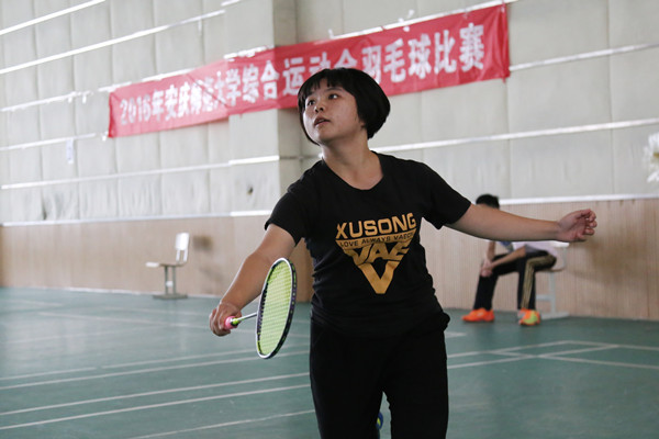 比赛一开始,裁判首先让运动员以猜硬币方式选择场地,选定后比赛也就正式开始了。第一轮62场比赛可以说各不相同,选手们之间或实力悬殊一方两局全胜,或旗鼓相当第三局仍争11分。“哇,快看,赛点来了。”一声大喊让场外的观众们不由得将目光都聚集到了2号场地上。只见一个选手轻轻跳起却又用迅雷不及掩耳之势挥拍一击,随着羽毛球的急速下落撞地,来自广播电视学专业14级汪佩便赢得了32进16的第三轮第2场比赛。“我一直都是自己练,但很早以来就喜欢和朋友们一起打羽毛球了。”从没有接受过羽毛球正规训练的她,却凭着一腔热血以11:4分和11:2分的成绩成功打败了对手进入16强,在谈到比赛的经验时,她说:“我觉得主要还是要让自己稳住,自己的节奏不要被带乱,减少失误。”