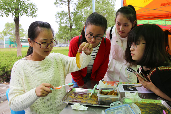 活动吸引了不少同学围观,外国语学院英语专业16级刘相宇就是其中之一,看完别人的制作过程后也加入到活动中。他从化学溶液中取出一片桂花树叶,平放在托盘上,一手按着叶片,一手用牙刷刷。“这是我第一次做叶脉书签,我觉得制作步骤看起来简单,但实际操作还是有一定难度,我做了两次才做好。如果以后有类似活动,我还是会参加,毕竟活动很好玩,也让我学到了一些生物知识。”