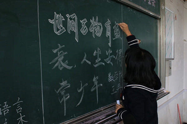 粉笔组文字或铿锵有力,或温婉圆润,各有特色。选手们四人一组,在黑板上写下抽到的试题。“我今年又来参加这个活动,因为去年没有发挥好,经过了一年充分的准备,我对自己接下来的表现很有信心!”来自14级特殊教育专业的雷帆是第二次参加比赛,她希望自己这次比赛能够获得好名次。