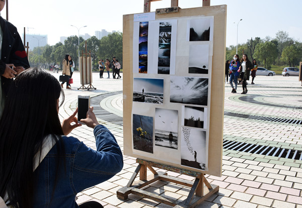 平常就喜欢拍照的16级美术学专业的何世义在知道摄影展后早早地来到了广场欣赏作品,在参观完所有作品后还给展出的作品点了一个大大的赞,“这些照片拍得都挺棒的,无论是在构图还是内容上,看完之后感觉自己对拍照有了一些新的感受。”因为喜欢摄影而加入了大学生摄影协会的16级计算机科学与技术专业的郝猛猛这两天一有空就到敬敷广场帮着协会举办摄影展,每当有人对照片提出疑问时他都会主动上前帮忙解答,“这些优秀作品有不少是协会的学长、学姐拍的,每次和别人介绍的时候我都感觉特别骄傲。”他还表示自己很喜欢这样的摄影展,不仅可以看到很多优秀作品,也可以让热爱摄影的同学有进一步接触到摄影的机会。