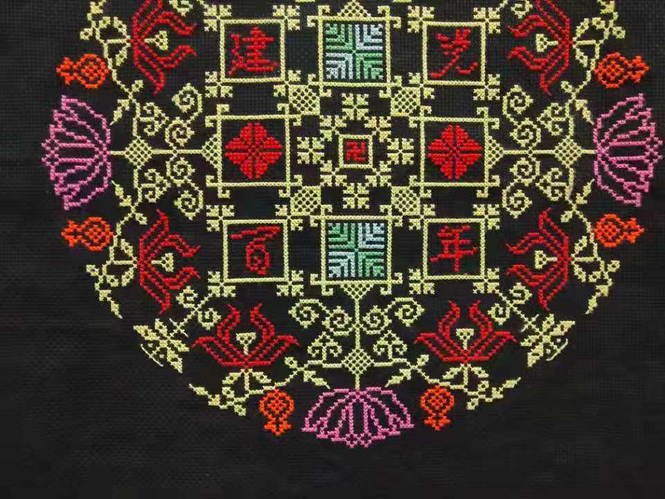 “上下两部分是挑花工艺中的传统回形纹,代表着生生不息,安宁吉祥的含义。”美术学专业2018(4)班的许竟对作品《建党百年挑花图》介绍到,作品的核心是传统元素万字纹,还运用了很多花卉元素做映衬,“作品表达了我对建党百年和祖国繁荣昌盛的美好祝福。”