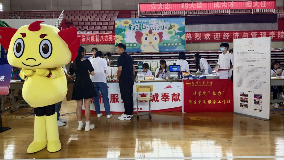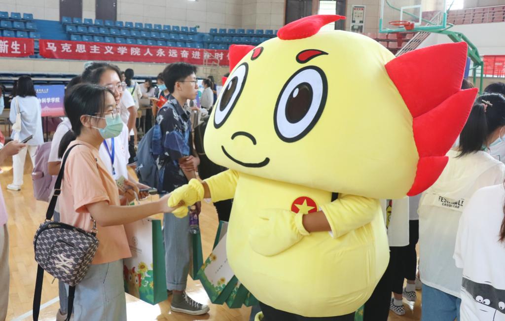 “哇!我们学院的吉祥物也太可爱啦!”“我想和吉祥物合影!”9月15日,在beat365体育馆新生报道处,身着玩偶衣的吉祥物“小角”正和学生热情互动,这是法学院在迎接2021级新生。