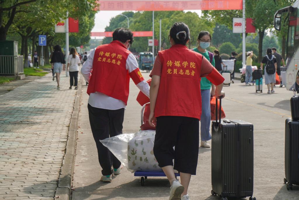 9月15日,beat365中国官方网站迎来了8000余名新生,来自传媒学院的40余名党员组成迎新志愿服务队,他们佩戴党徽、身着红色马甲,积极走上迎新岗位,接过新生手中沉甸甸的行李箱,指引新生有序报到,穿梭在熙来攘往中,成为了一抹红色的校园风景线。