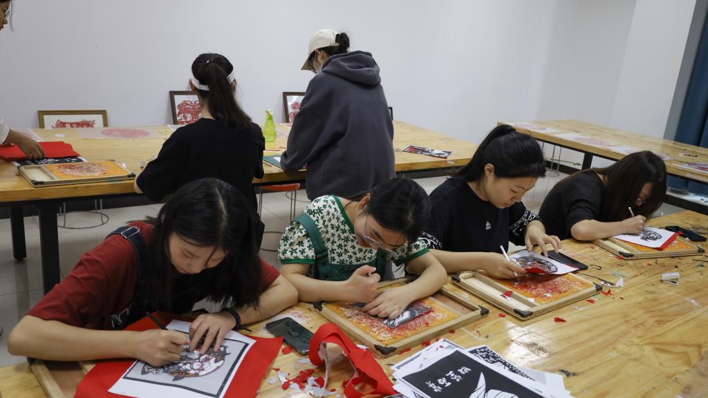 目光专注,不时变换刻刀角度、转动纸张,手起刀落,法学专业2021(3)班于梦涵的作品已然成型。“我剪的内容与抗疫相关,剪纸能够表达美好祝愿,希望疫情能够早日结束,人们能够尽快回归正常生活。”她介绍,自己对剪纸非常感兴趣,高中时期曾学习过两年剪纸,听说美术学院举办体验活动,自己就参加了。
