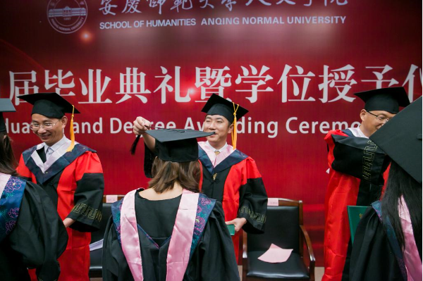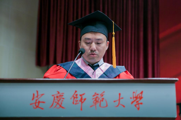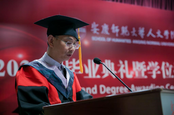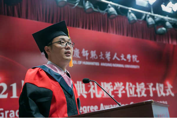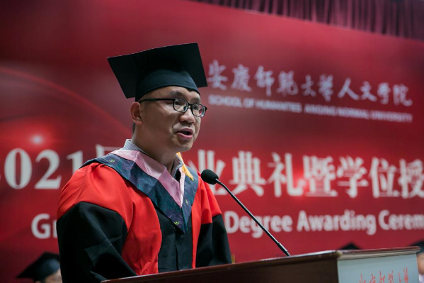 仪式在雄壮的国歌声中拉开序幕。人文学院党委书记张红飞讲话。他首先向2021届全体毕业生表示热烈祝贺,向所有为毕业生的成长付出辛勤汗水的老师、亲友和社会各界朋友致以衷心的感谢。他以老学长的身份勉励全体毕业生今后不论身处何地,都能脚沾泥土、仰望苍穹,眼中有诗、心向远方,把人生绘成大写的模样!他希望,全体毕业生同学要胸怀家国,志气凌云,提升人生的高度。把雄心壮志融入新时代的澎湃洪流,一心向党、忠心爱国、立足岗位、勤勉奋斗,在追逐人生梦想的征途中为实现中华民族伟大复兴的中国梦贡献力量、奉献青春;要初心如磐,砥砺前行,探索人生的深度。初心的坚守,彰显人生的深度,“根”扎得越深,“叶”才能更茂;“地”踩得越实,“天”才会更高;要向阳而生,逐光而行,增加人生的温度。要有能力爱自己,有余力爱别人,在感受岁月静好中,努力为他人负重前行,在遭遇凄风冷雨时,依然选择热爱和希望;要行而不辍,履方致远,扩展人生的广度。扩展人生的广度,在于开拓自己的视野、提升自己的能力,这需要我们不仅要立足书本学习,还要参与更多的实践,做到“日日行,不怕千万里;常常做,不怕千万事”,用一个一个坚实的脚印,丈量出自己每一天的成长进步。
