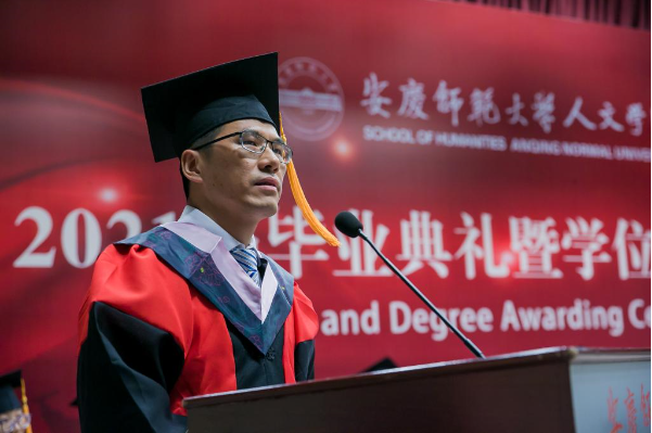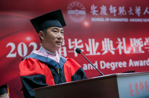 校“三全育人”最美教师、人文学院教授、硕士生导师江飞作为教师代表为毕业生送上祝贺与期待。他勉励毕业生永远不要忘记自己作为人文知识分子身份和责任,成为一个脚下有根心中有光的人。