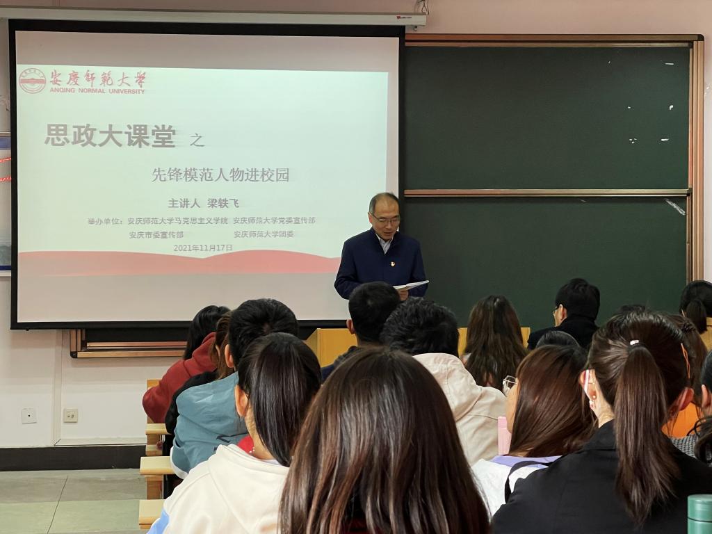 11月17日,马克思主义学院、学校党委宣传部、安庆市委宣传部、学校团委举办“思政大讲堂之先锋模范人物进校园”专题报告会。全国优秀共产党员——安徽省桐城市水利局党组成员、水利局水保工程建设管理所所长梁轶飞受邀作报告,学院党委书记金文斌、学校团委副书记赵丽丽、学院团委负责人与120多名学生代表参加本次活动。