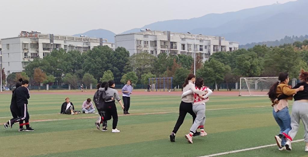 两人三足比赛也同样受人关注。老师们两两一组搭档进行,在“一二,一二……”的节奏声中快速跑向终点。