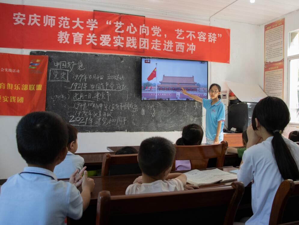 7月15日,大学生艺术教育俱乐部联盟组建的“艺心向党 艺不容辞”教育关爱实践团,为太湖县天华镇西冲村留守儿童开展党史学习教育,引导童心向党,为学习百年党史、传承红色基因搭建桥梁。