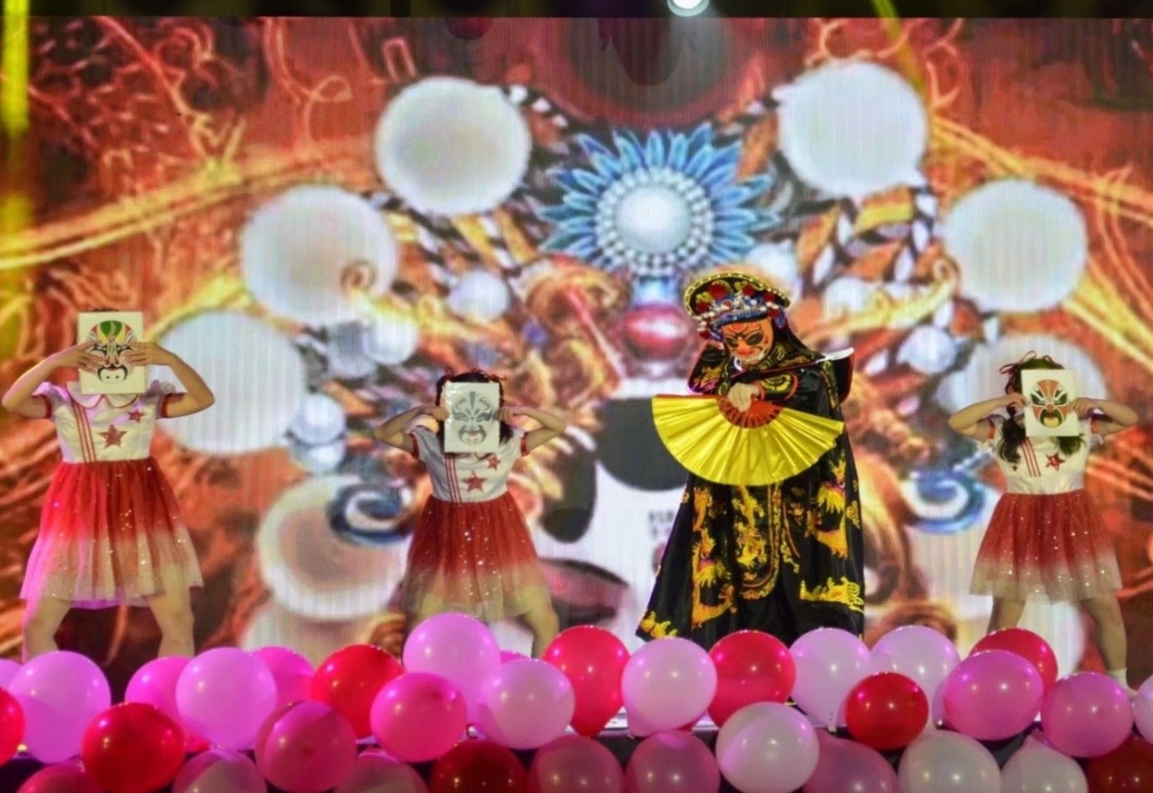 “校园里搭戏台,稀罕稀罕真稀罕。”儿童舞《校园里有大戏》将晚会推至高潮,川剧变脸令人眼前一亮。在折扇起落之间,在戏袍飞舞之下,在短短五分钟内,表演者学前教育专业2019级(3)班(对口)的方贤连换了12个脸谱,8种颜色,引得观众掌声连连。为了此次表演,她练习了一个月左右。“变脸难度系数较高,所以得一直练,有时还会练到凌晨三点。”方贤表示希望同学们在观看了此次节目之后,可以走进戏曲,感受中华传统文化之美。