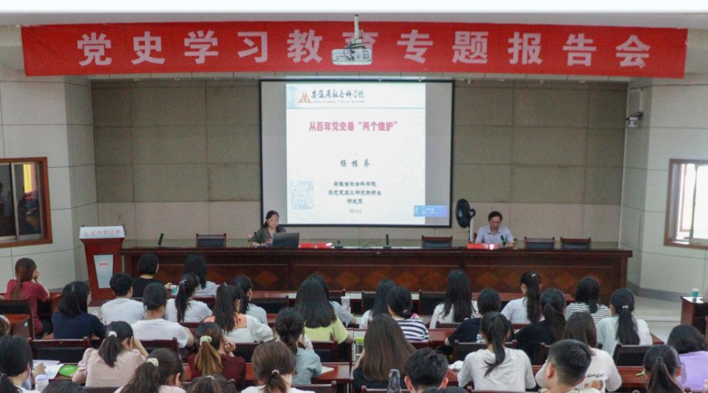 揭牌仪式结束后,工作站71名成员集体参加了党史学习教育专题报告会,听取了安徽省社会科学院马克思主义研究所所长、二级研究员杨根乔带来的《从百年党史看“两个维护”》专题报告。