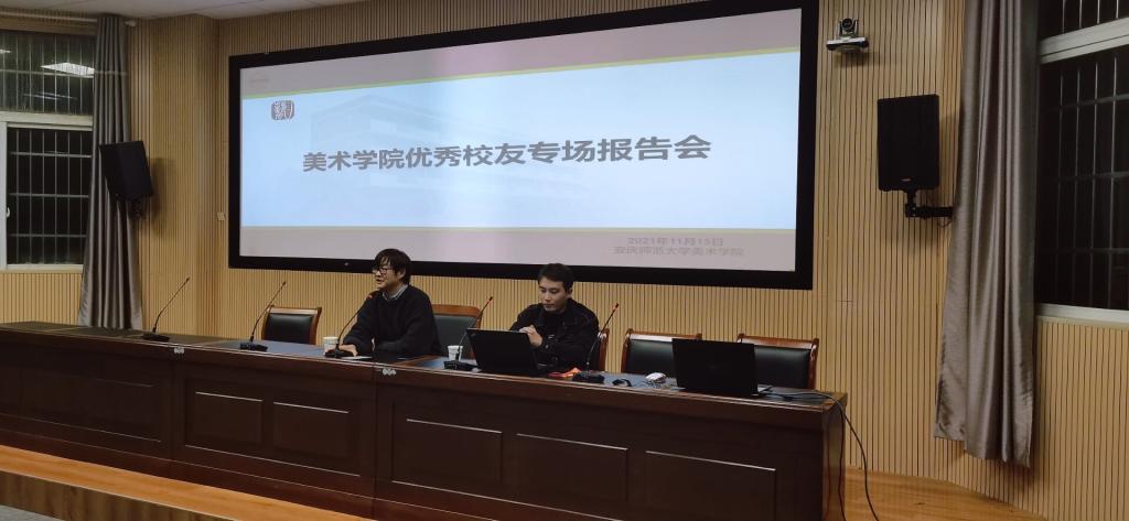 11月15日,美术学院在学术报告厅举办优秀校友专场报告会,学院邀请安徽省美术家协会会员、黄山市书画院特聘画家、2015届优秀毕业生储嘉军为学生们作报告,报告会由学院党委副书记查国平主持,200余人聆听了本次报告,此次报告会在抖音平台进行同步直播。