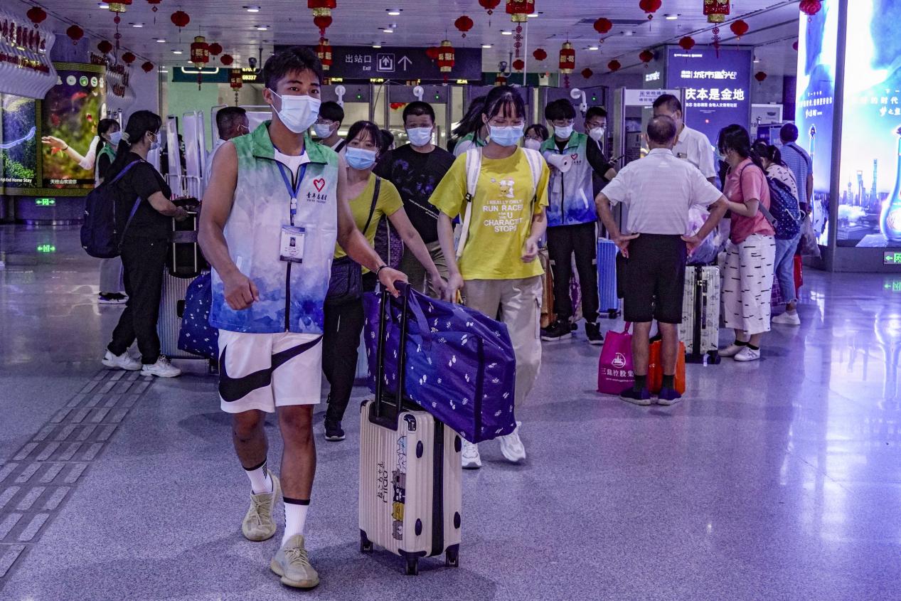 从出站口到前广场,一路上都能看到不少主动为新生和家长分担行李的志愿者。“新生从出站口出来,由志愿者带出去测温扫码,便可直接乘坐班车进入校园。”出站口处,法学专业2020(2)班的侯红岩一直在用喇叭引导新生。高铁站内十分闷热,不停有汗珠挂在侯红岩的脸上,“志愿者们配合得都很默契,看到每一批新生都能以最快的速度到达学校,我们的付出就是值得的。”他说。