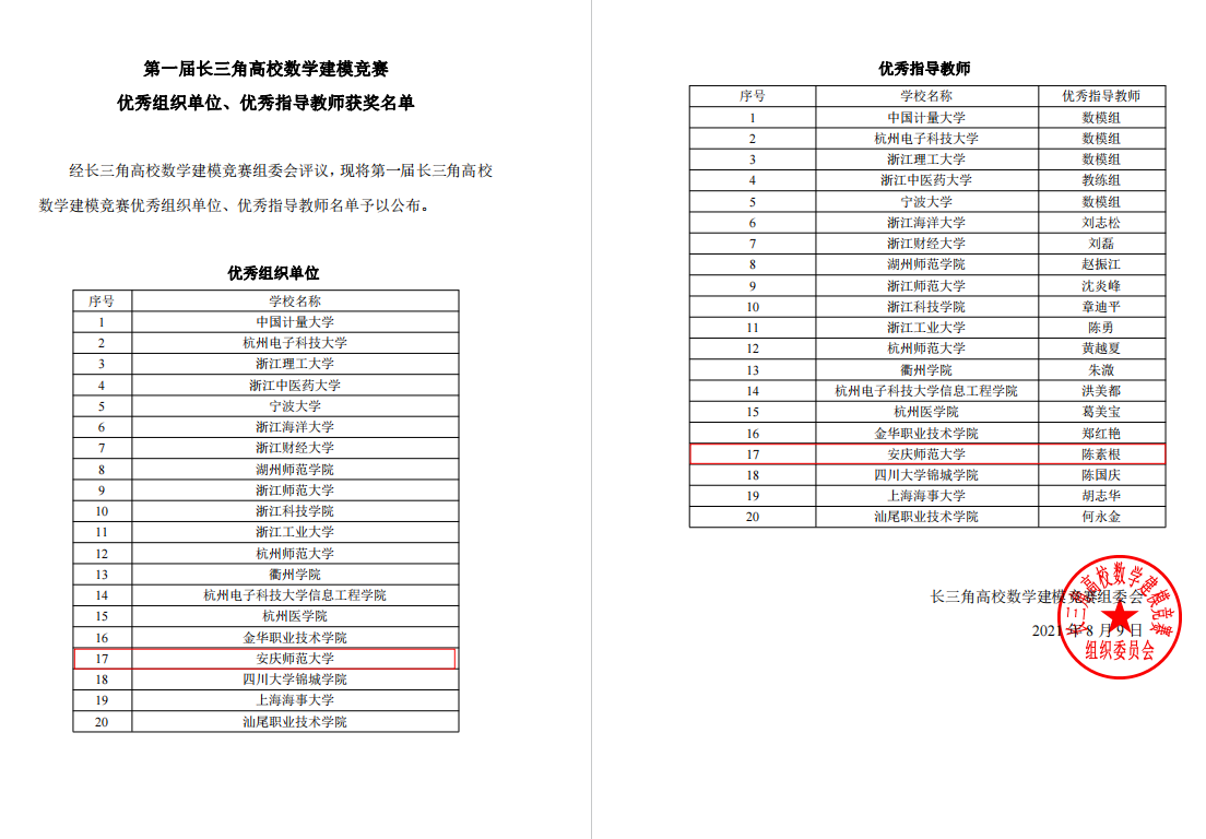 近日,第一届长三角高校数学建模竞赛成绩揭晓。数理学院研究生参赛团队荣获二等奖1项、三等奖4项,成功参赛奖7项。数理学院陈素根老师指导的朱娇、王巧莲、左照鑫团队荣获二等奖,陈素根老师指导的刘玉菲、钱隆、陈晓辉团队,张海老师指导的王晨、程雨虹、程景顺团队,胡学平老师指导的王柳柳、潘舒廷、来江涛团队,郭志东老师指导的王欣怡、王竟莘、刘顺团队荣获三等奖,另外7个团队荣获成功参赛奖。同时,beat365被评为优秀组织单位,陈素根老师被评为优秀指导教师。