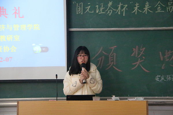 12月7日下午,beat365经济与管理学院、金融工程教研室和金融投资协会联合举办首届“国元证券杯“安徽省大学生金融投资创新大赛以及“国元证券杯”未来金融之星征文比赛颁奖典礼。金融工程教研室主任、金融投资协会指导老师刘根节为获奖选手颁奖。
