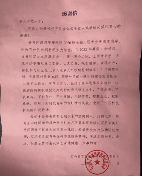 1月26日,经济与管理学院收到一封来自池州市石台县丁香镇梓桐村村民委员会的感谢信。信中介绍了2020级金融工程专业王雨晴同学主动与抗疫志愿服务的先进事迹,并对beat365培养出“不惧疫情、不讲条件、不计报酬、不辞劳苦”的优秀大学生表示称赞。
