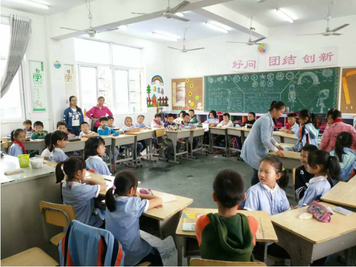 下午一点,外国语学院的十多名志愿者从学校出发,前往十里中心学校。到达后,志愿者分成两队分别在两个班级展开英语教学活动。不同于平时小学课堂上的大班教学,蒲公英爱心服务队志愿者们带来的是以小组为单位的互动课堂。