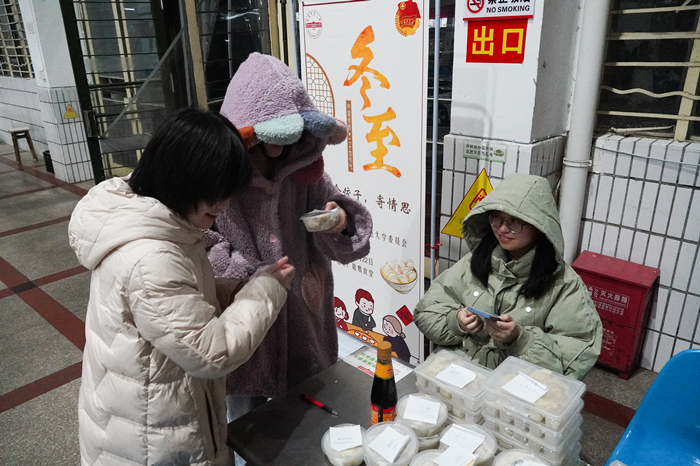 12月22日晚10点,在beat365中国官方网站菱湖校区敬敷食堂中,还有一家“水饺店”仍未打烊、向刚刚结束自习的学生们供应免费水饺,原来,这是由校社团发展中心所举办的“情暖冬日,倾心包饺”活动,在购买材料、自制水饺以及蒸煮打包后,由中心各个主任与干部们向学生免费发放水饺。