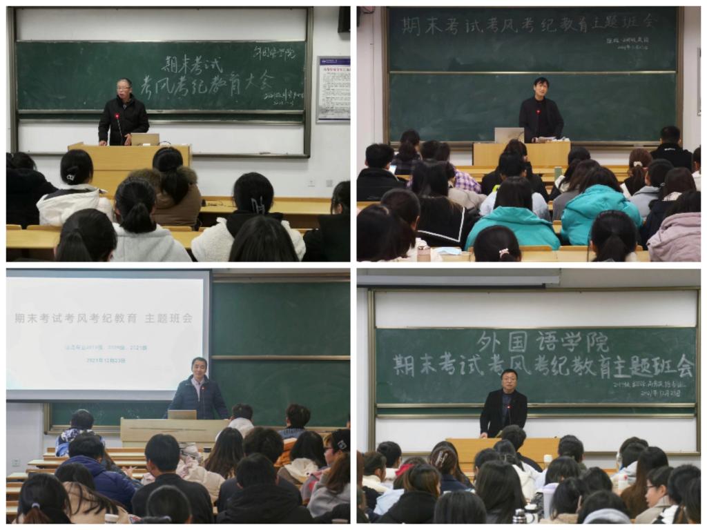李亦亮谈及大学考试与高中考试的区别——只有累积的优秀,没有侥幸的成功。大学考试有五考:考水平、考公平、考人品、考班风、考管理。考试不仅是检验学习情况的有效途径,更是个人品质的体现。王先荣指出,诚信考试是对知识的尊重,确保考试结果的公正、客观,才能真正检验自身学习的效果。外语专业的学生需要学习更宽领域的知识,提高专业知识的应用能力,努力培养自己成为复合型人才。江加宏、黄全灿分别从不同角度向同学们说明了考试是教师了解教学情况、提高教学质量的重要途径,也是同学们检验一学期所学知识的重要方式,希望同学们端正态度,积极迎考,共同促进学院的优良学风。