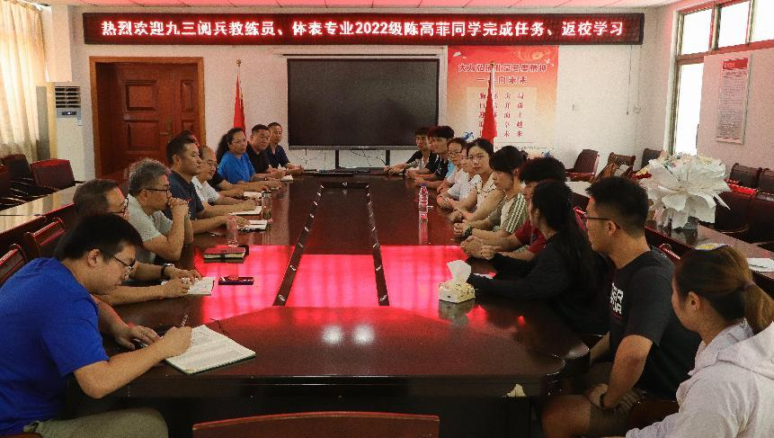 9月5日,体育学院三楼会议室里掌声雷动。刚结束阅兵任务的表演(体育艺术表演方向)专业2022级(1)班陈高菲,在返校次日便参加了一场特别的欢迎会。体育学院领导班子、团委负责人、班级辅导员、班级同学、退役复学学生党员参加座谈会。陈高菲用211天的高强度训练、五年军旅生涯和一句“十一排面,拒绝凹陷”的口号,诠释了新时代青年对“家国情怀”与“专业精神”的深刻理解。