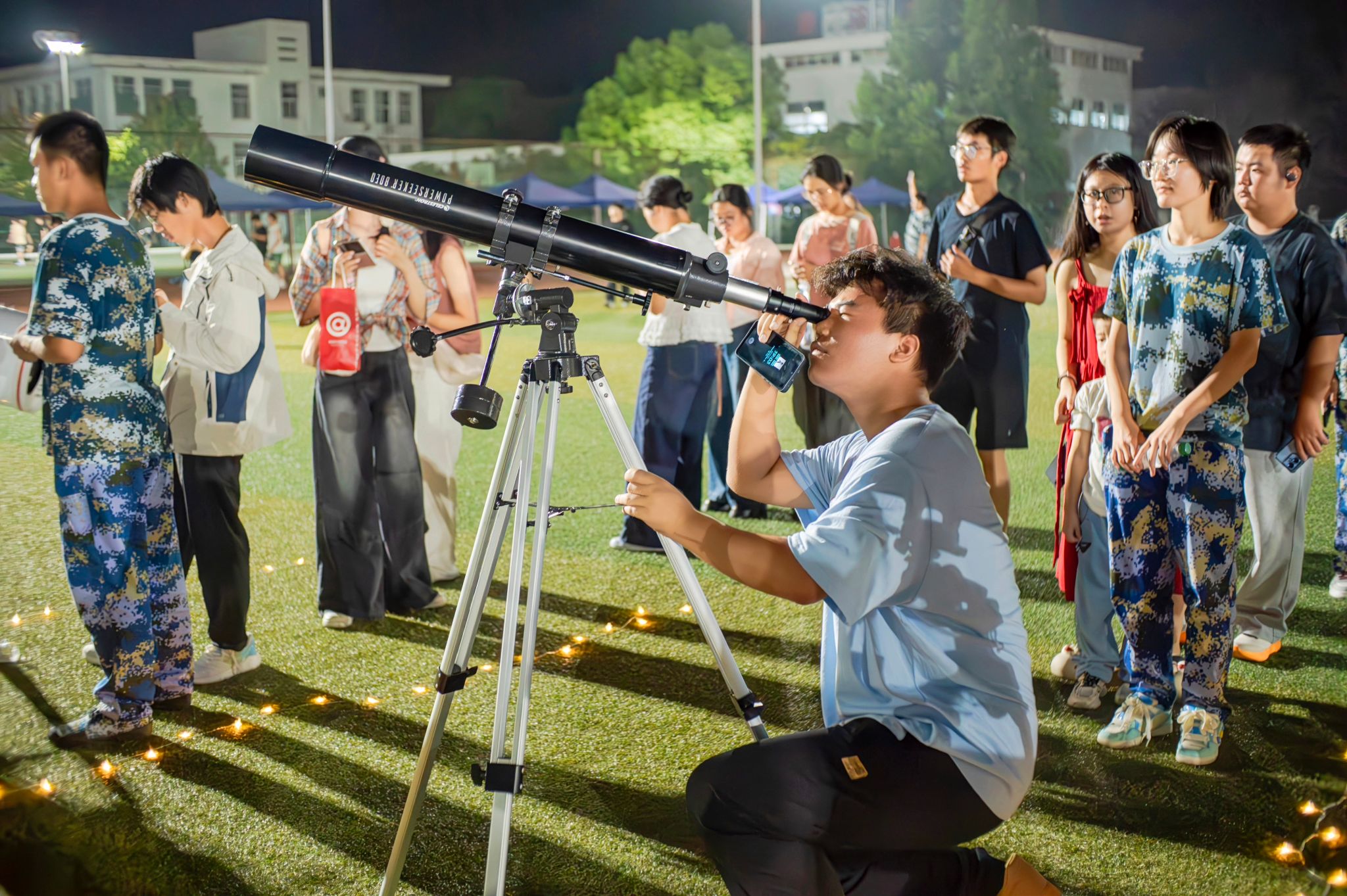 夜幕渐深,草坪旁的围坐区传来阵阵欢笑,投壶的喝彩、下棋的思索、品茶的悠然交织成独特的校园夜曲。“我们举办这个活动,就是想让师生们在学校也能感受到国庆、中秋的双节氛围。”数理学院团委负责人看着眼前的热闹景象分享,“把天文观测和汉服、灯谜、剪纸、缠花这些有温度的传统文化结合起来,大家既能探索星空,也能感受中华优秀传统文化。”