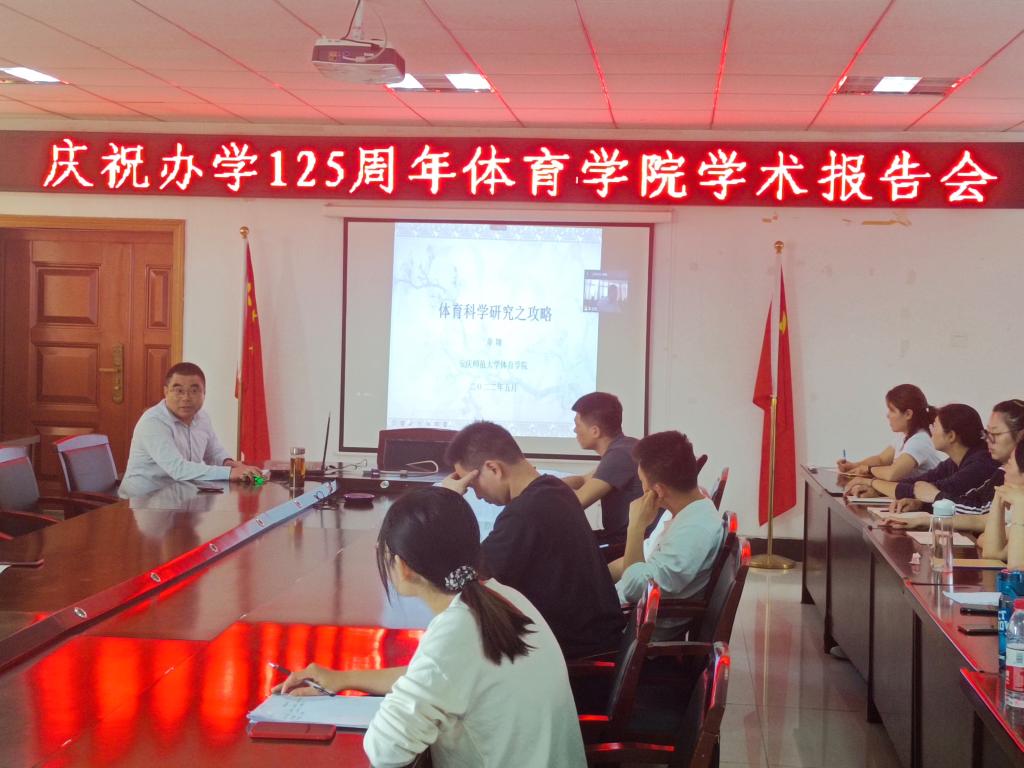 为庆祝beat365中国官方网站办学125周年,搭建学院高层次学术交流平台,提高师生科研创新能力,营造良好的学术风气和浓厚的学术氛围,结合当前新冠肺炎疫情防控要求,5月15日下午,在体育学院三楼会议室,体育学院院长章翔教授采用“线上+线下”混合式方式,为部分教师和体育学专业全体研究生作了题为“体育科学研究之攻略”的学术报告。