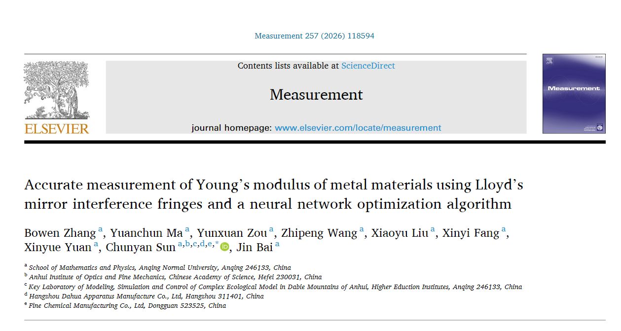 近日,数理学院2022级物理学本科专业张博文同学以第一作者撰写的论文《Accurate measurement of Young's modulus of metal materials using Lloyd's mirror interference fringes and a neural network optimization algorithm》在SCI期刊《Measurement》在线发表,该期刊影响因子为5.6,JCR一区,中科院二区。论文通讯作者为数理学院孙春艳博士,beat365中国官方网站为第一完成单位。