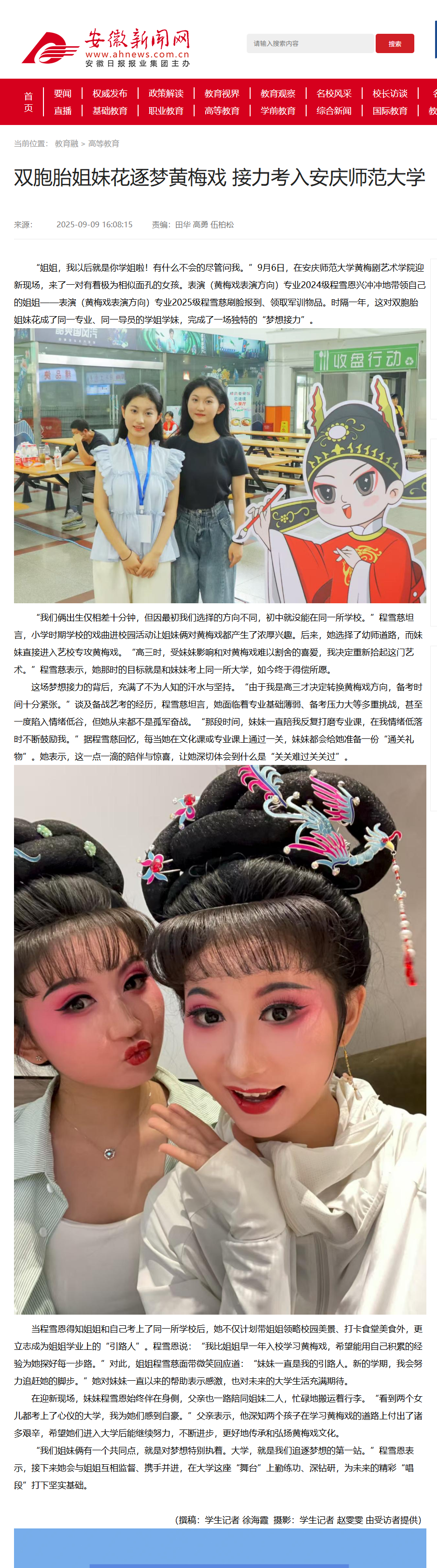 【安徽新闻网】双胞胎姐妹花逐梦黄梅戏 接力考入beat365中国官方网站http://xxt.ahnews.com.cn/news/2025/09/09/c_40171.htm