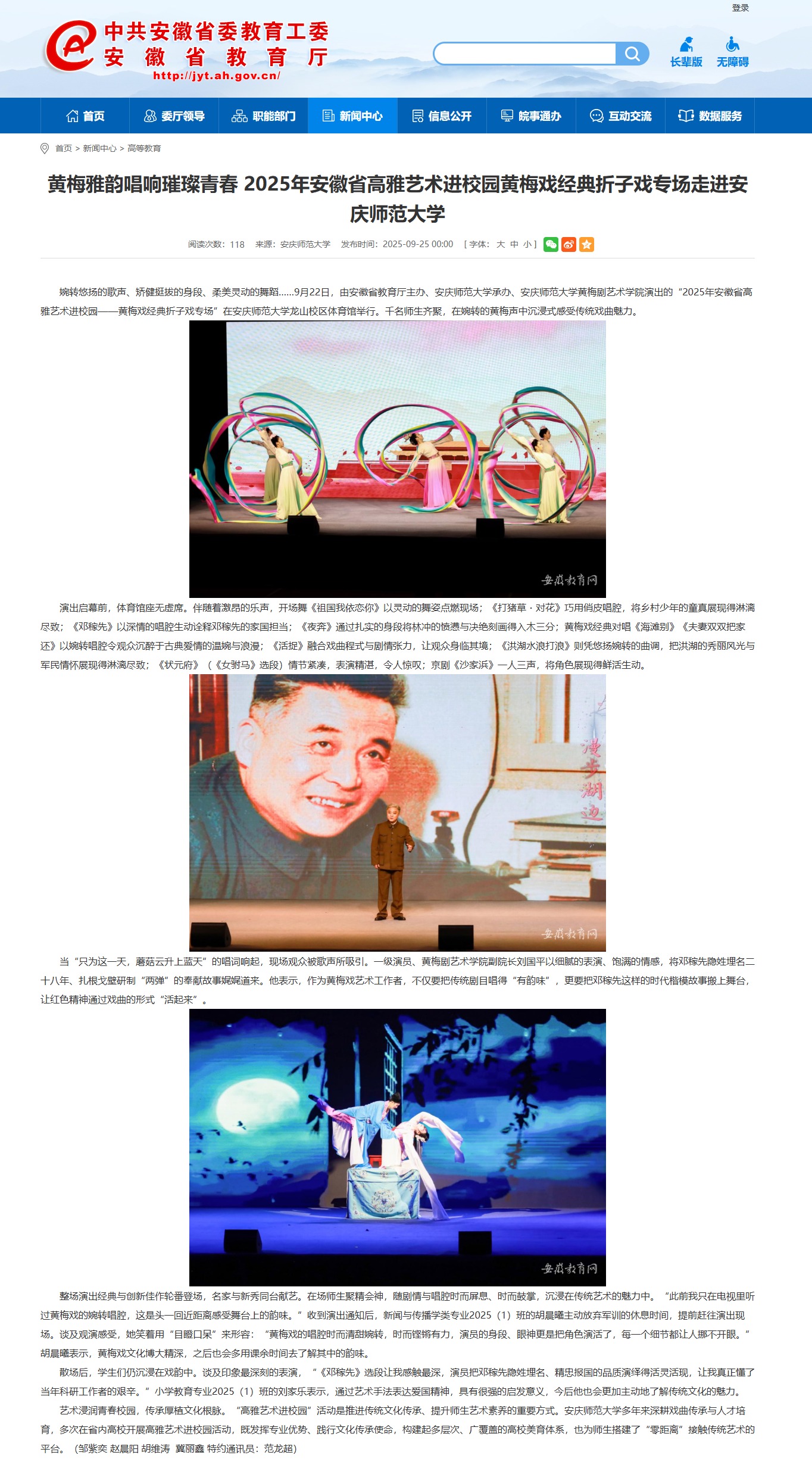 安徽教育网:黄梅雅韵唱响璀璨青春 2025年安徽省高雅艺术进校园黄梅戏经典折子戏专场走进beat365中国官方网站