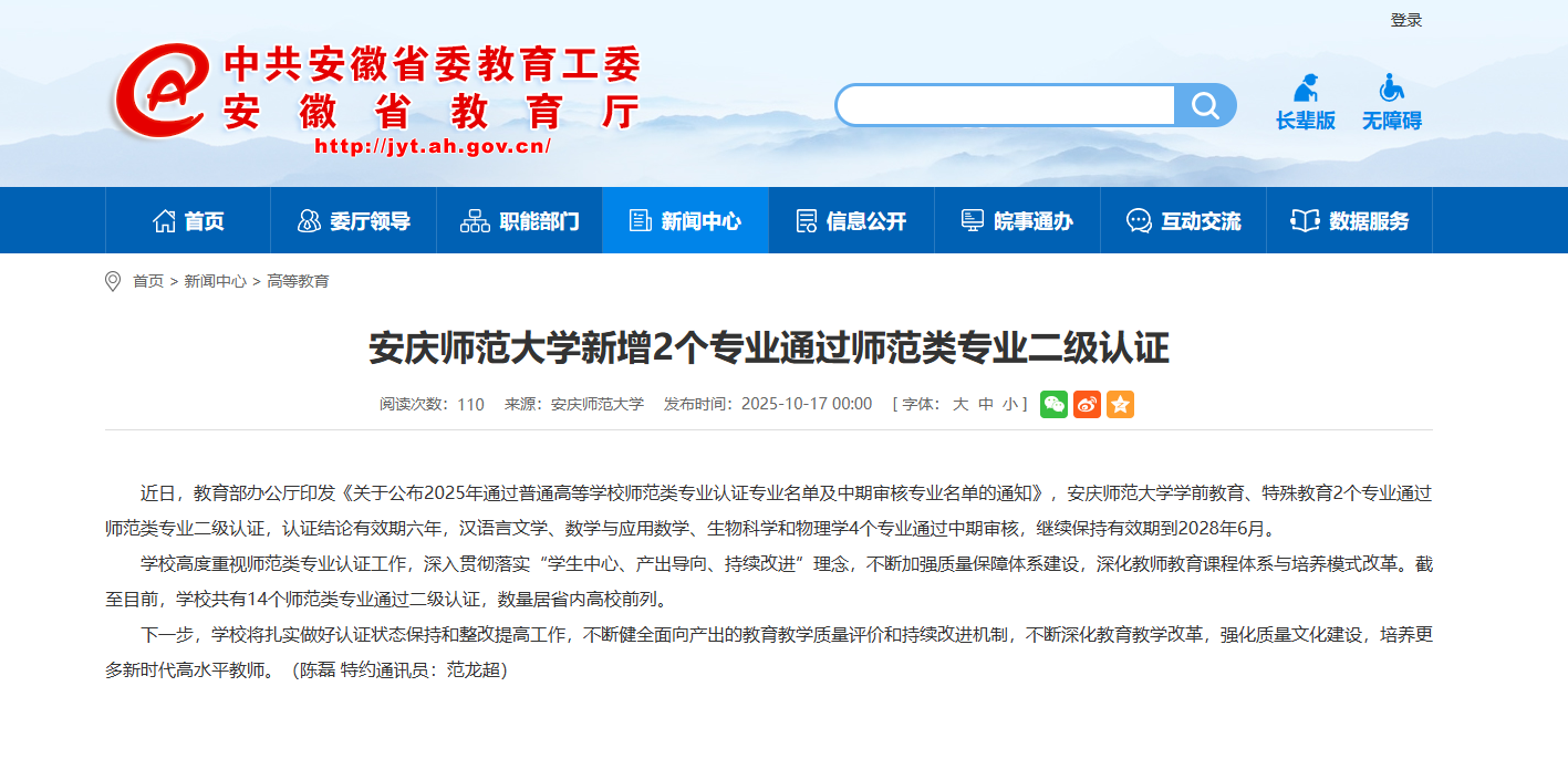 【安徽教育网】beat365中国官方网站新增2个专业通过师范类专业二级认证https://jyt.ah.gov.cn/xwzx/gdjy/40769208.html